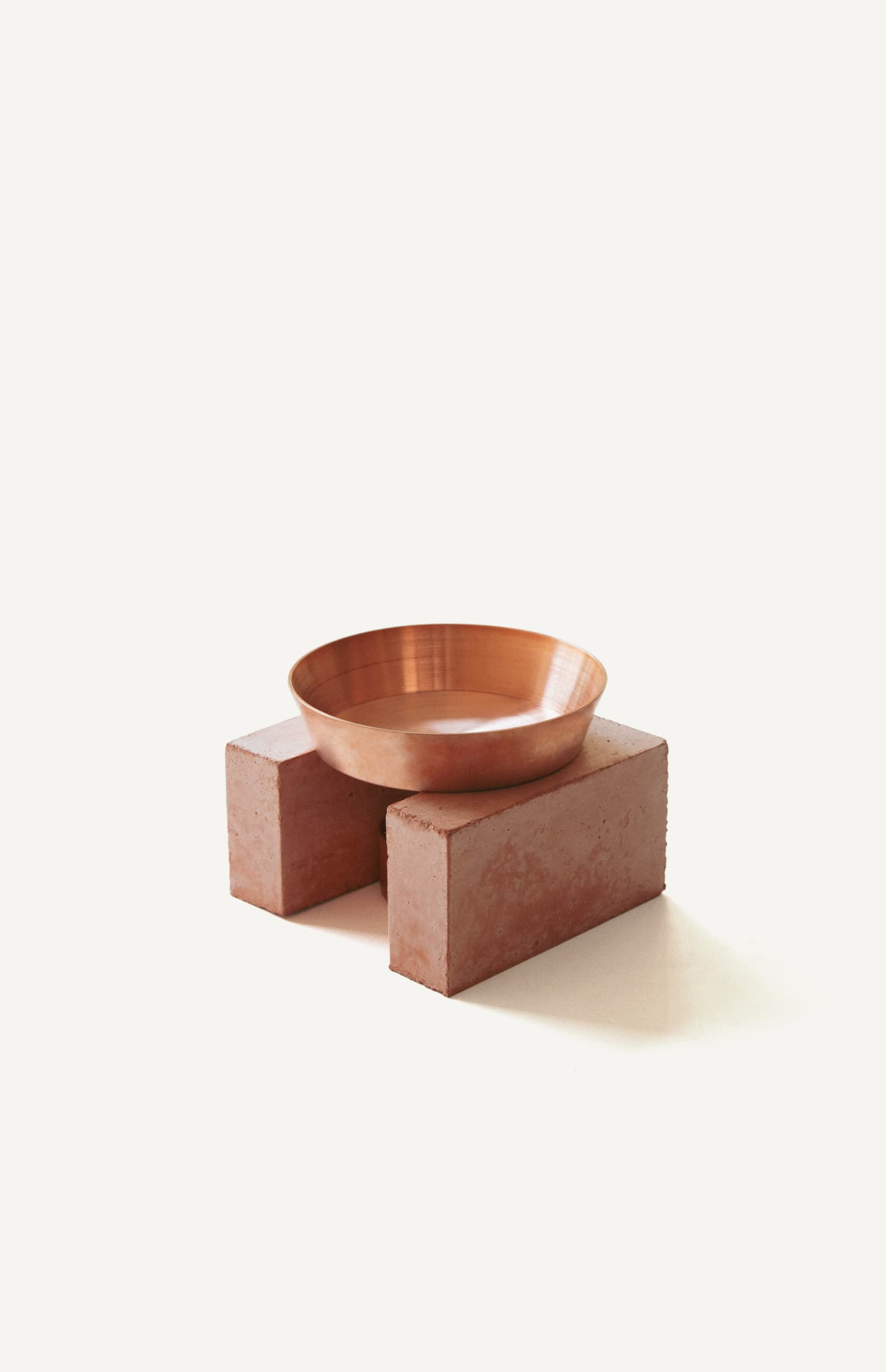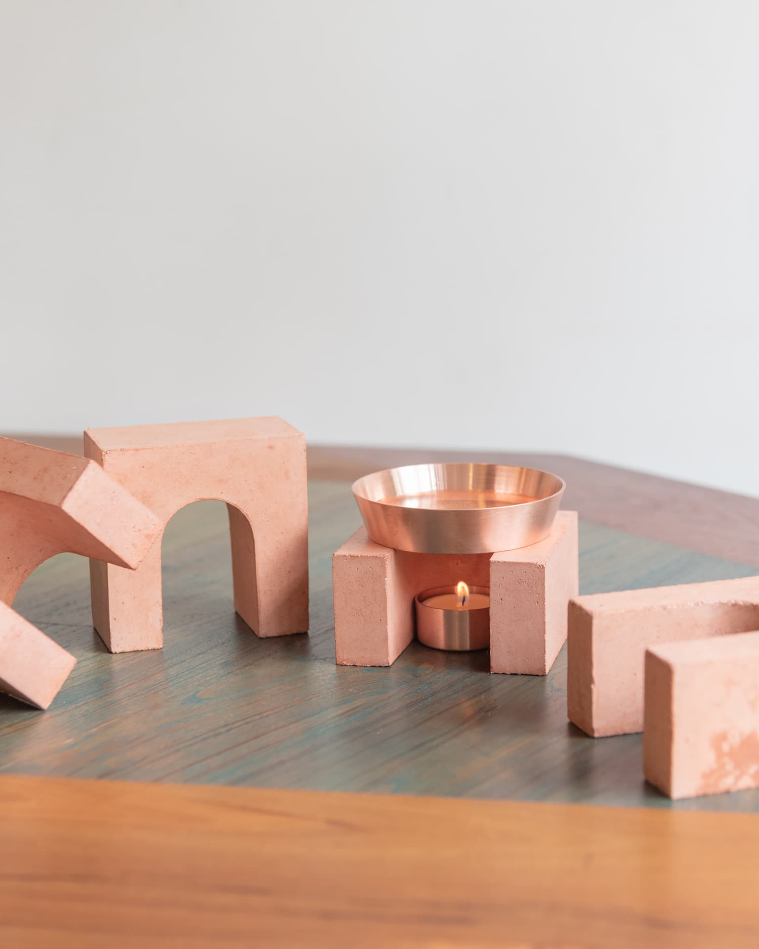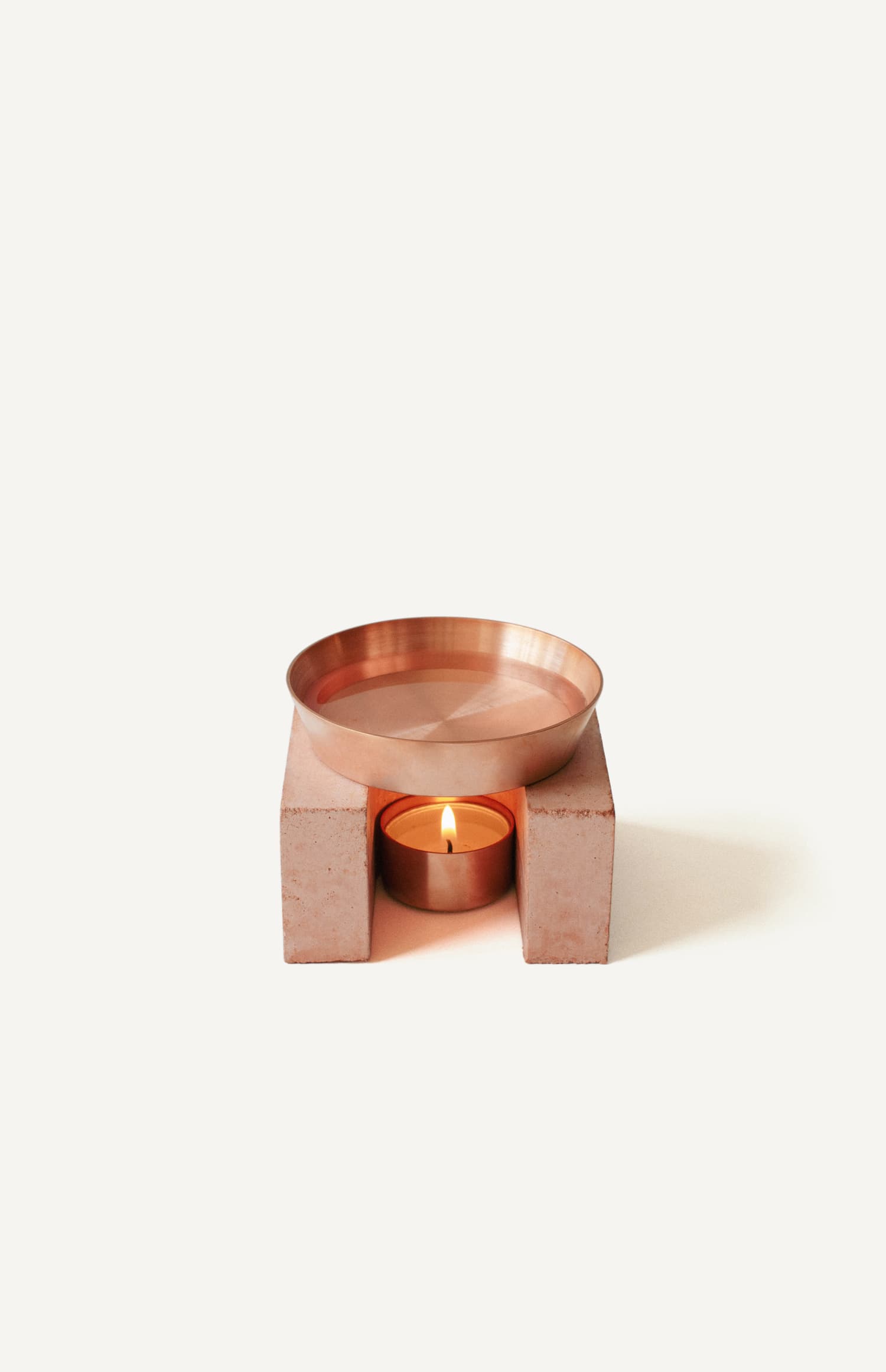 Made from slaked lime, recycled and crushed terracotta, and spun copper, each piece is hand made, cured, and finished with locally sourced bees wax. Nested inside a copper vessel, the tea light emits a soft glow while simultaneously warming the water and essential oil in the basin above filling the room with fragrance.