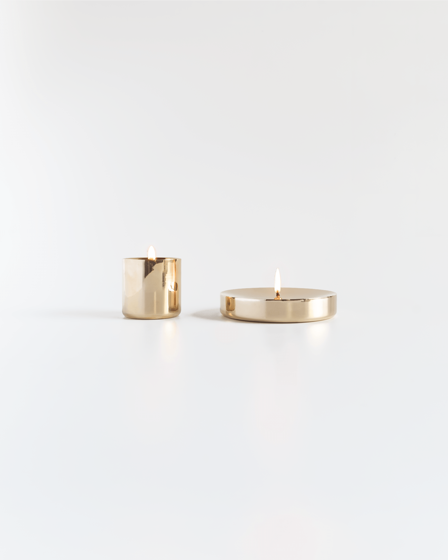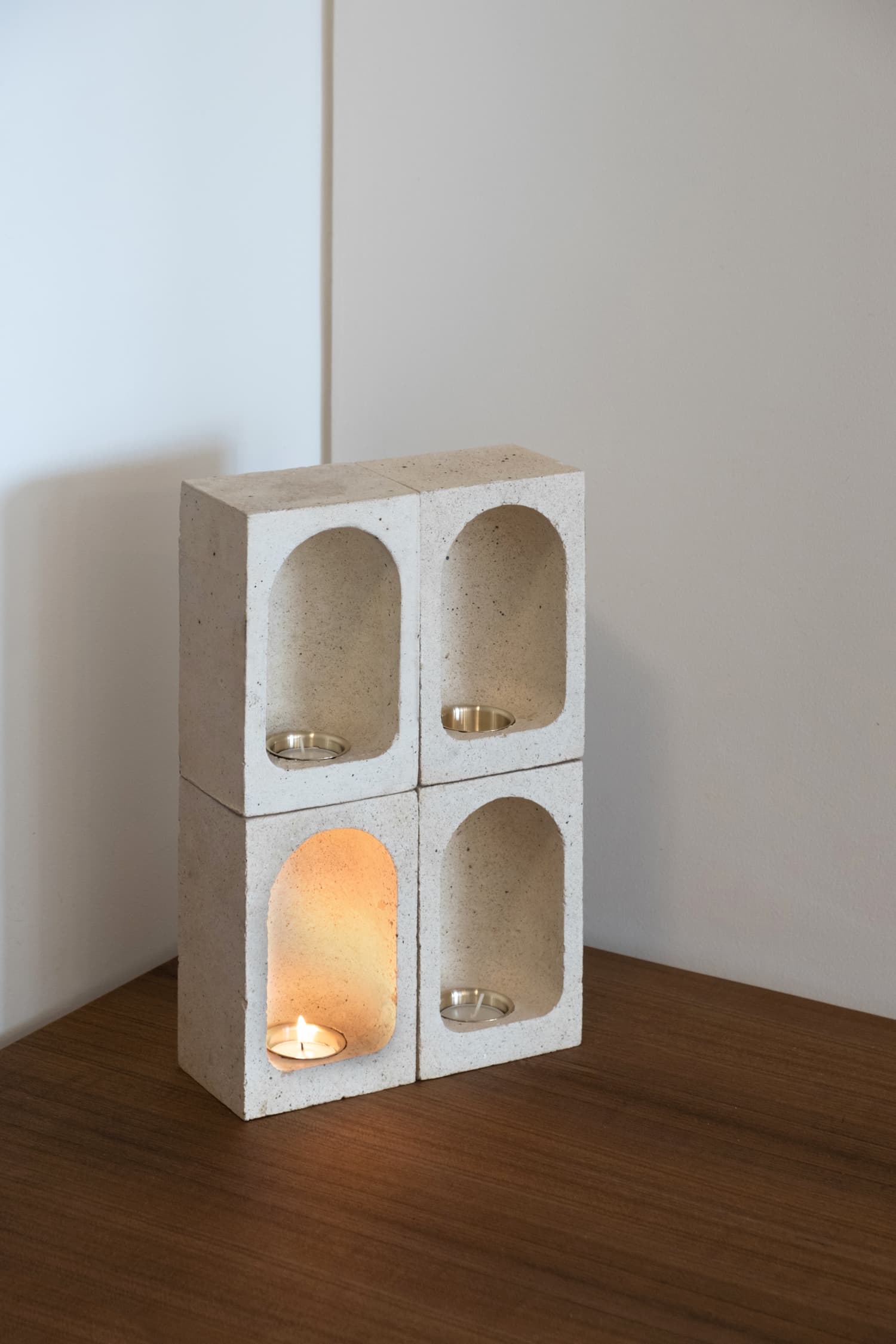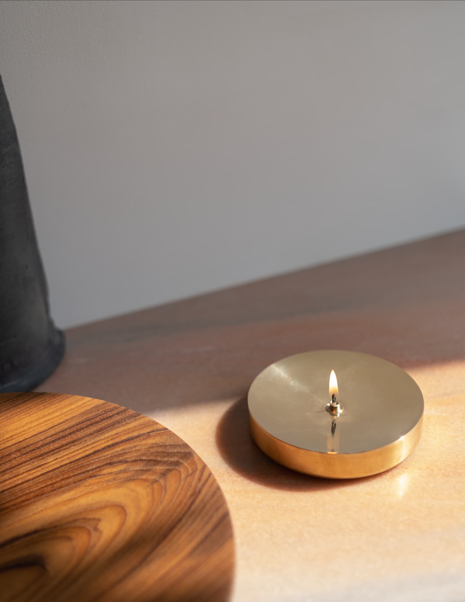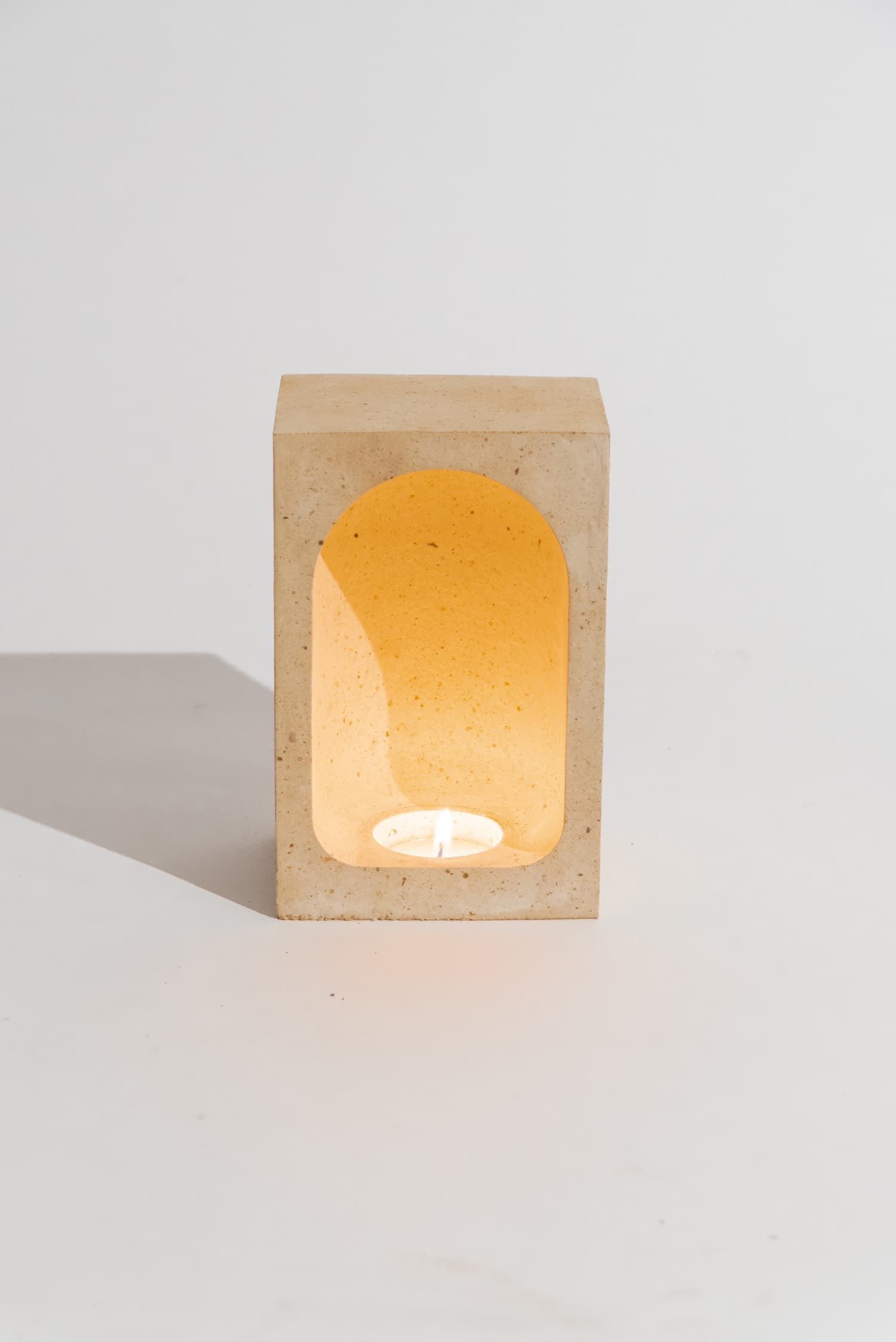 Made from slaked lime, recycled and crushed terracotta, and spun copper, each piece is hand made, cured, and finished with locally sourced bees wax. Nested inside a copper vessel, the tea light emits a soft glow while simultaneously warming the water and essential oil in the basin above filling the room with fragrance.