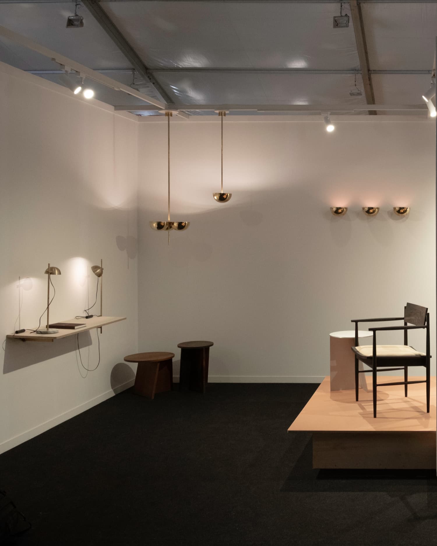 Each series on display marks a fresh exploration ofmaterials, processes, and formal expressions thatcollectively enhance our offerings. A collection of chairs - The Drift and Spindle series, and Lights – Ouline, Post Lamp and Hemisphere series.