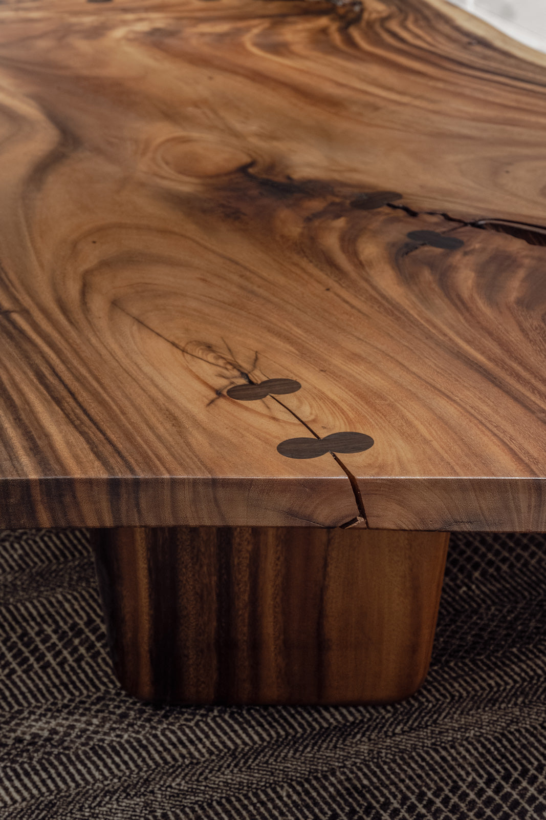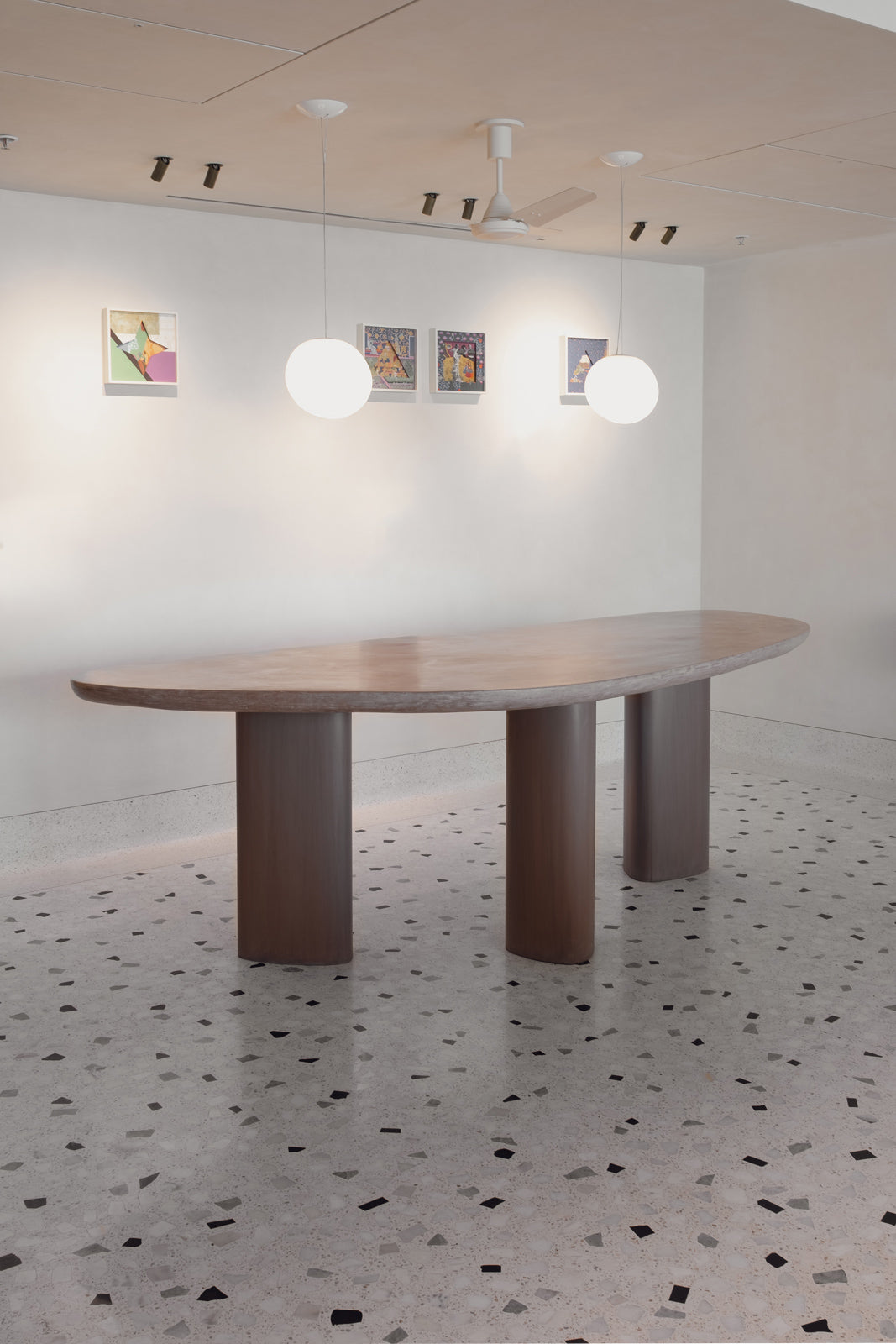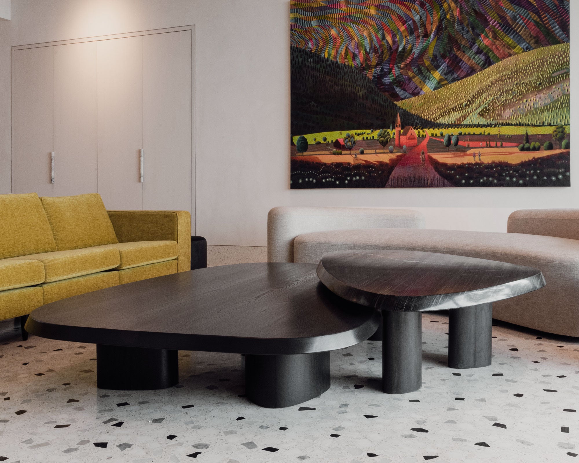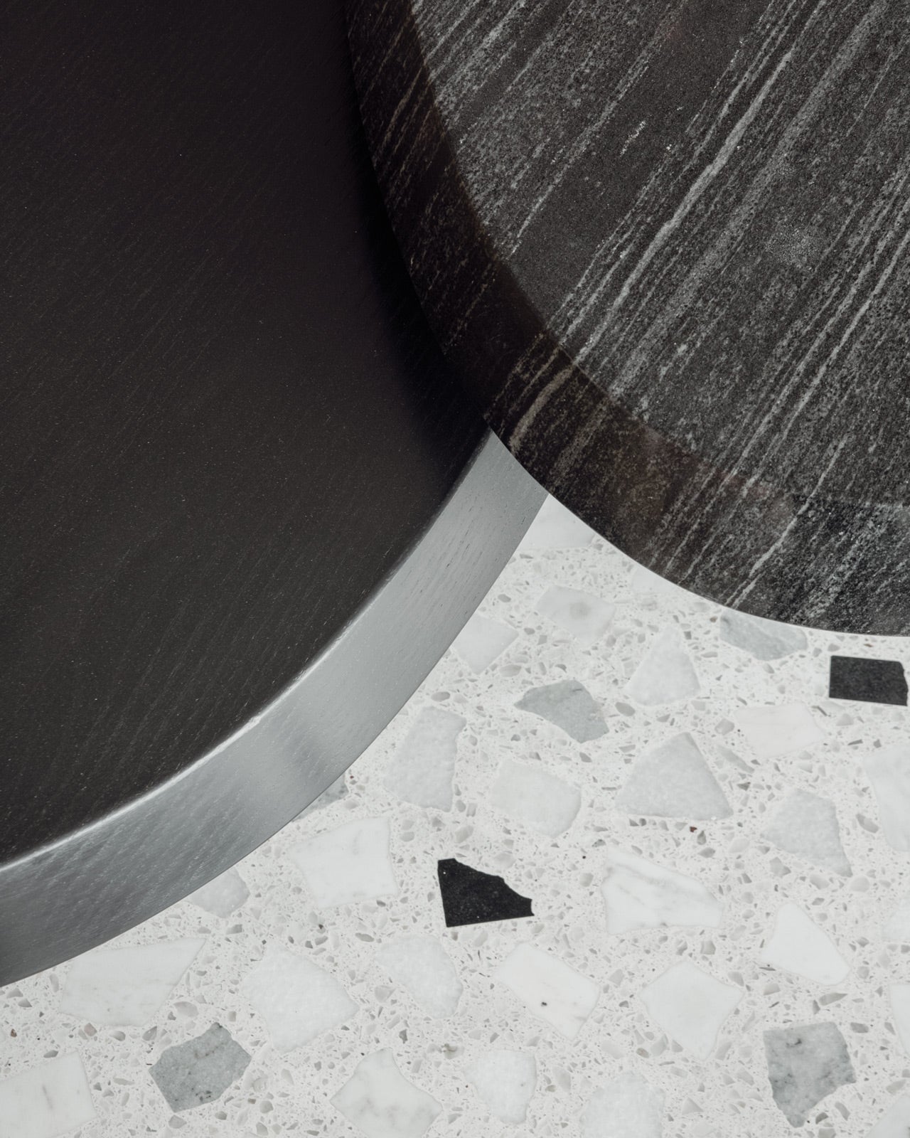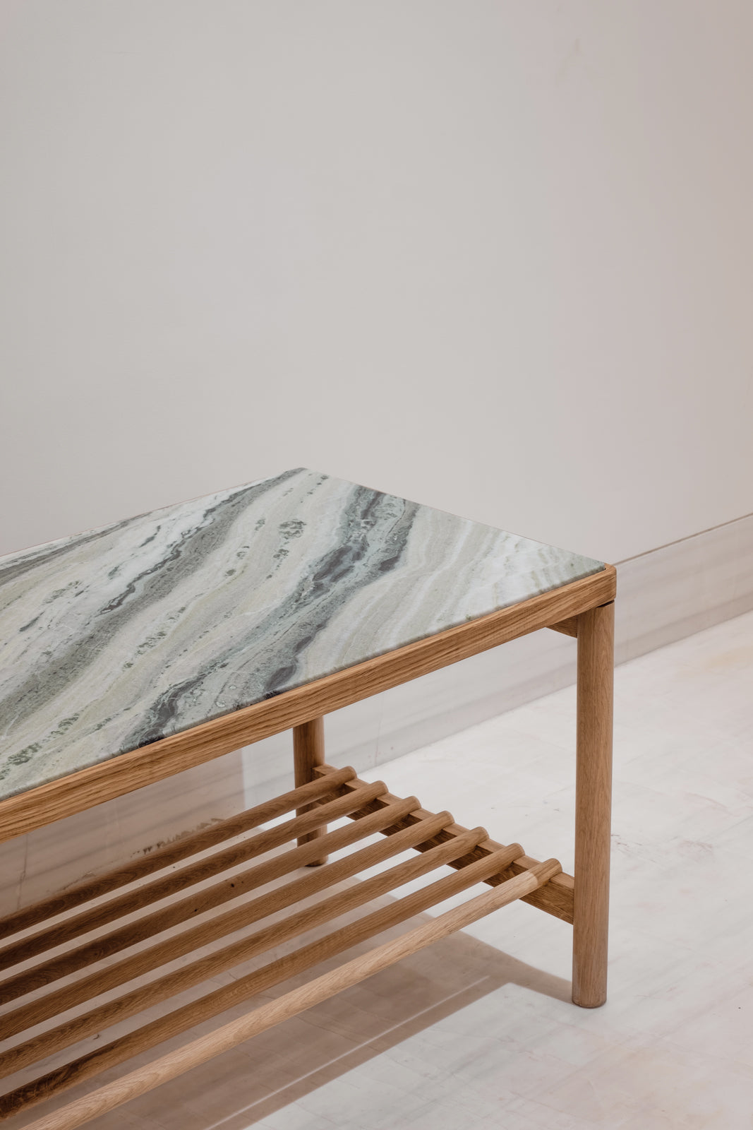 The centre table forms one of the key focal points - a pair of tables with beveled-edge wood and stone tops. The bar counter was conceived with a similar design language, allowing the elements to sit together with clarity and cohesion.