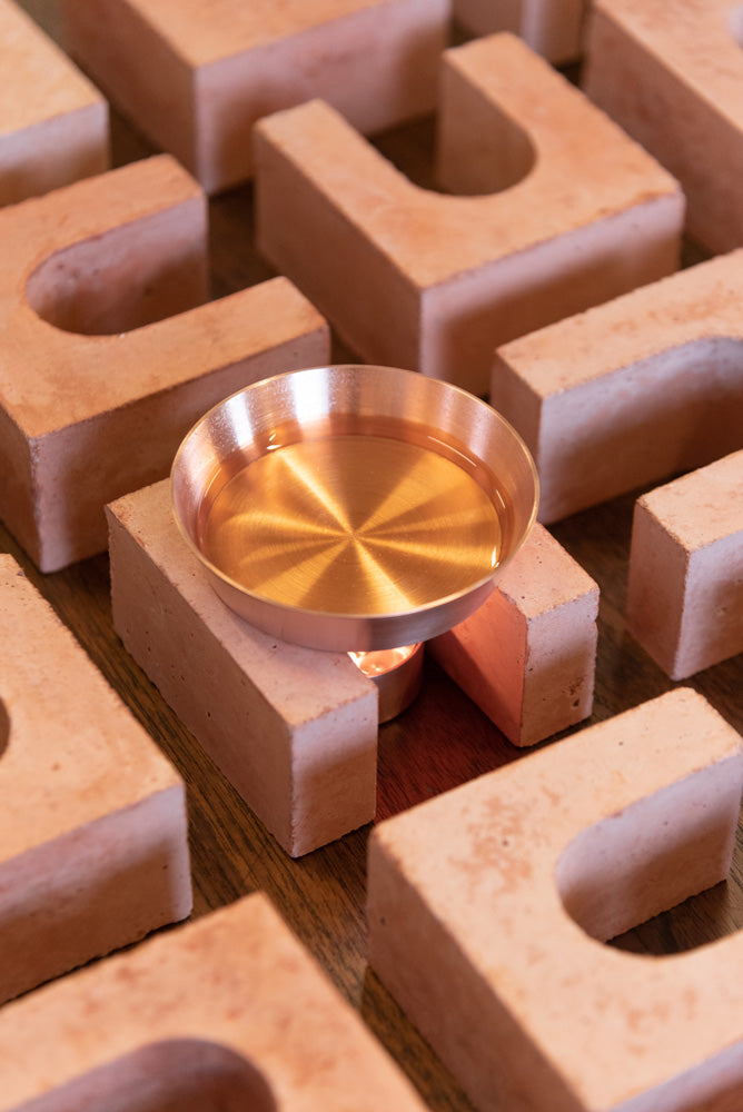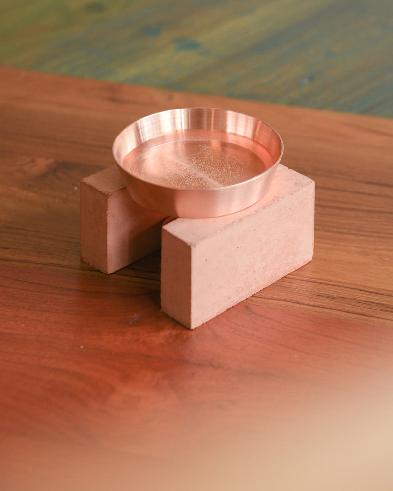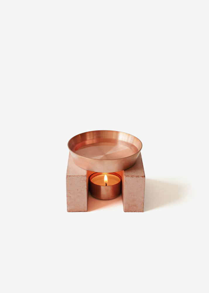 Hand made with slaked lime and recycled terracotta, each diffuser base is finished with locally sourced beeswax. A tea light placed below a copper vessel gently warms the water and essential oil above, releasing a soft glow and a subtle fragrance.