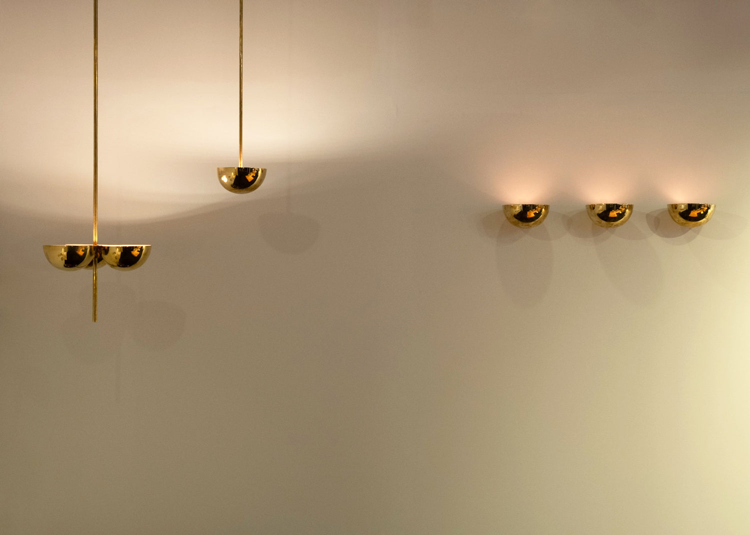 Formed in solid brass and inspired by simple, enduring geometry, these lights are available as individual fixtures or clustered groupings. Each dome is hand-painted internally in a muted pink that reflects a warm, welcoming light. The brass will deepen in character as it naturally patinates over time.