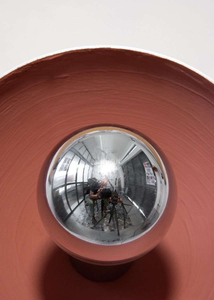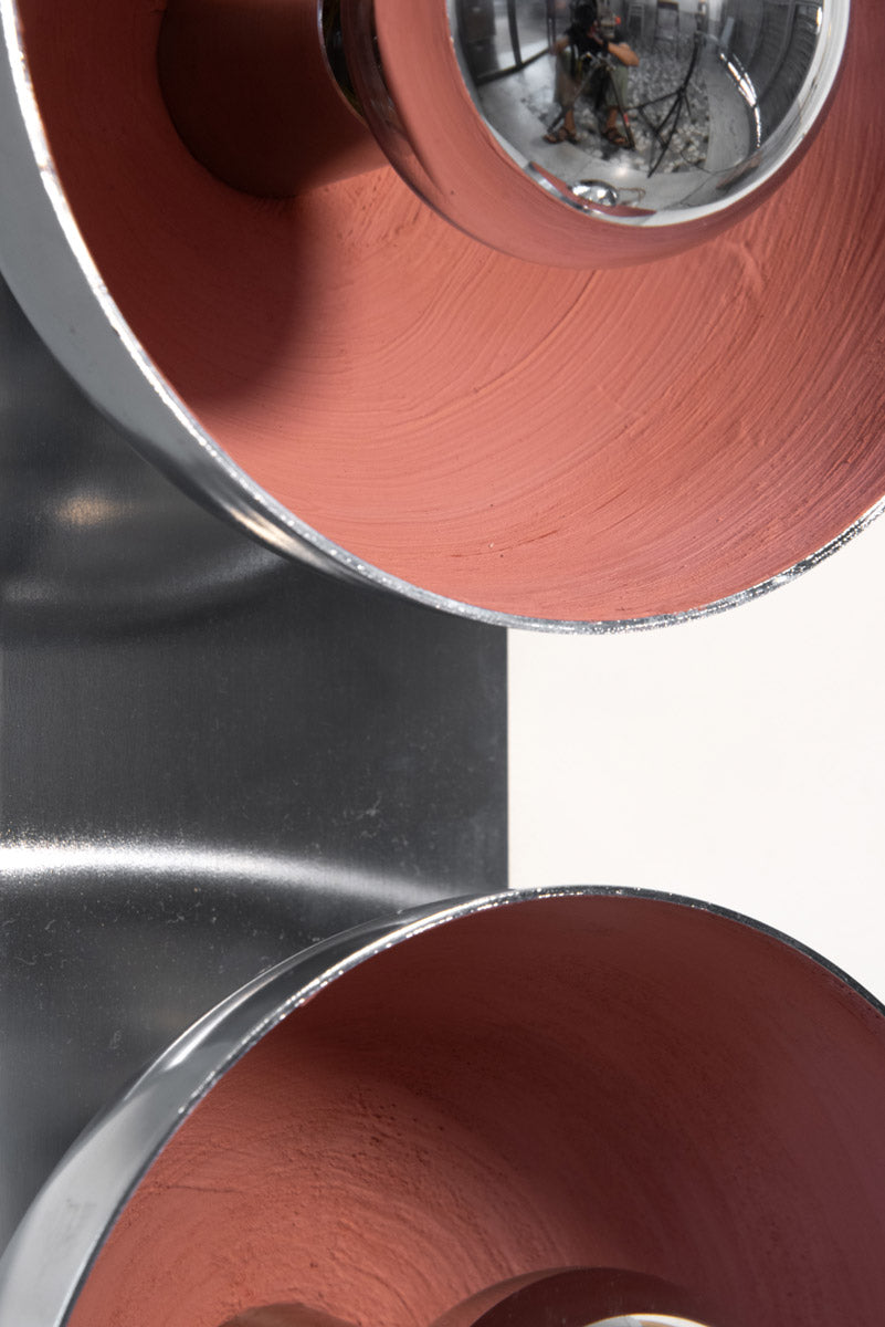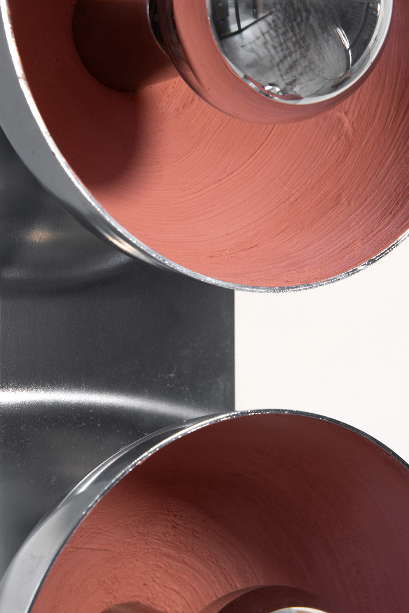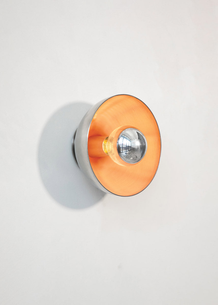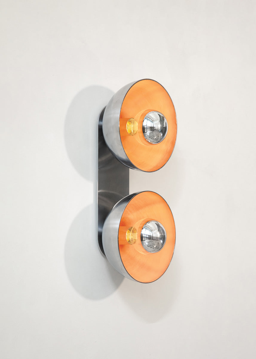 The wall mounted, Front Facing Light is made from nickel plated aluminum hemisphere/s hand painted with a custom pigmented wash. The use of a hemispherical ‘mirror’ light bulb reverses the formal language and helps radiate a soft, indirect light.