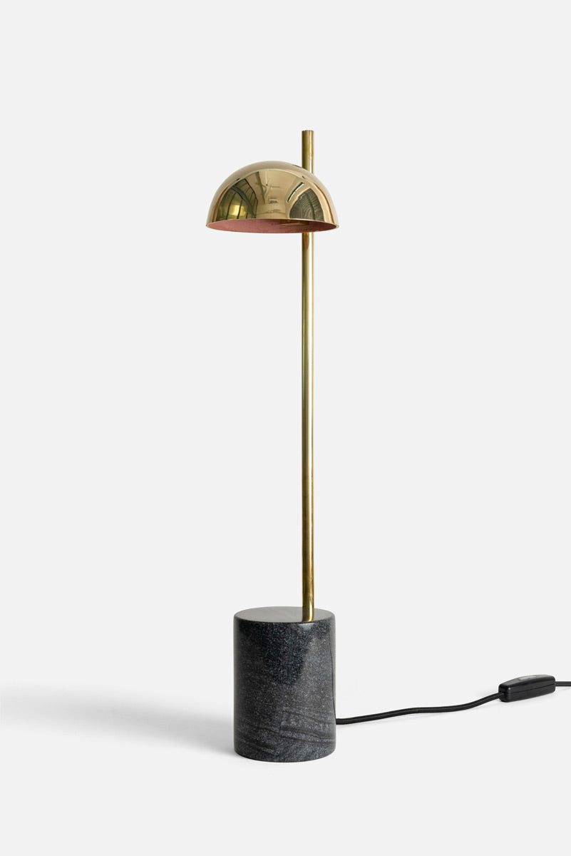 Weighted by a simple marble cylinder at the base, a single brass rod supports an offset hemisphere that is hand painted inside with a custom pigmented wash. Offered in both floor standing and tabletop options, the lamp is defined by its basic linear geometry.