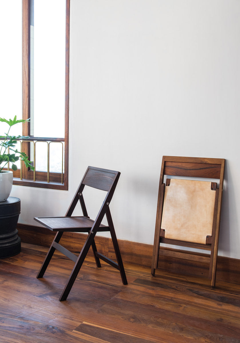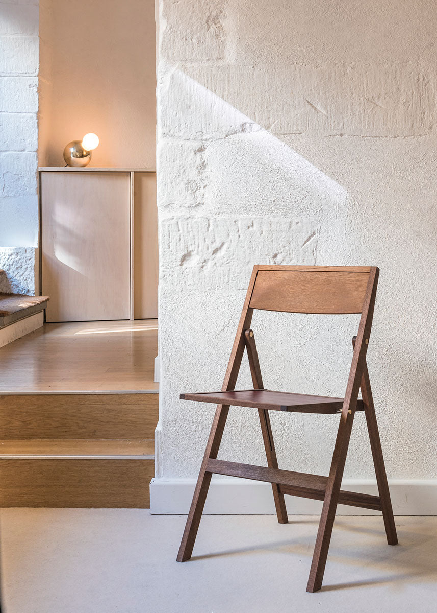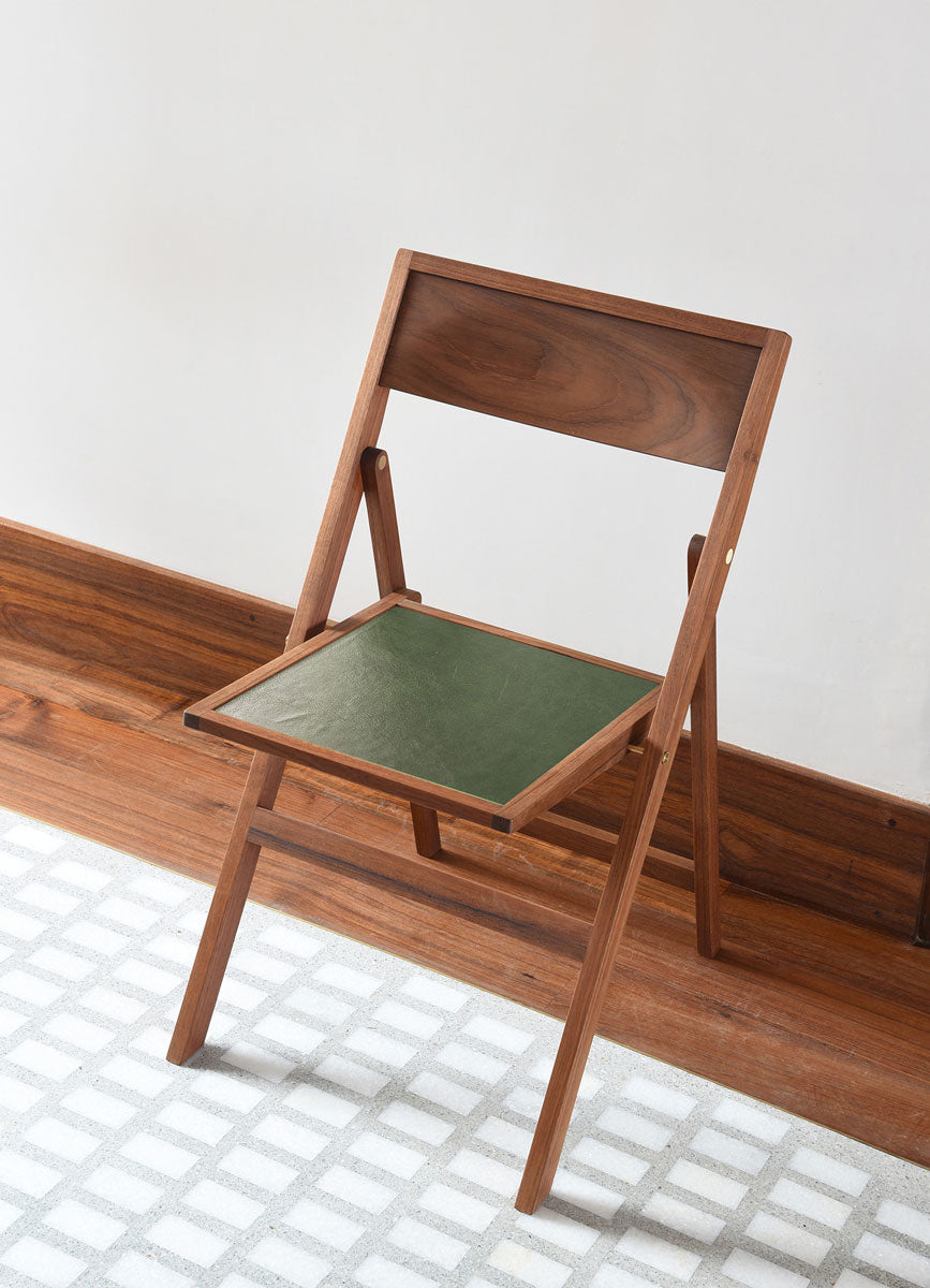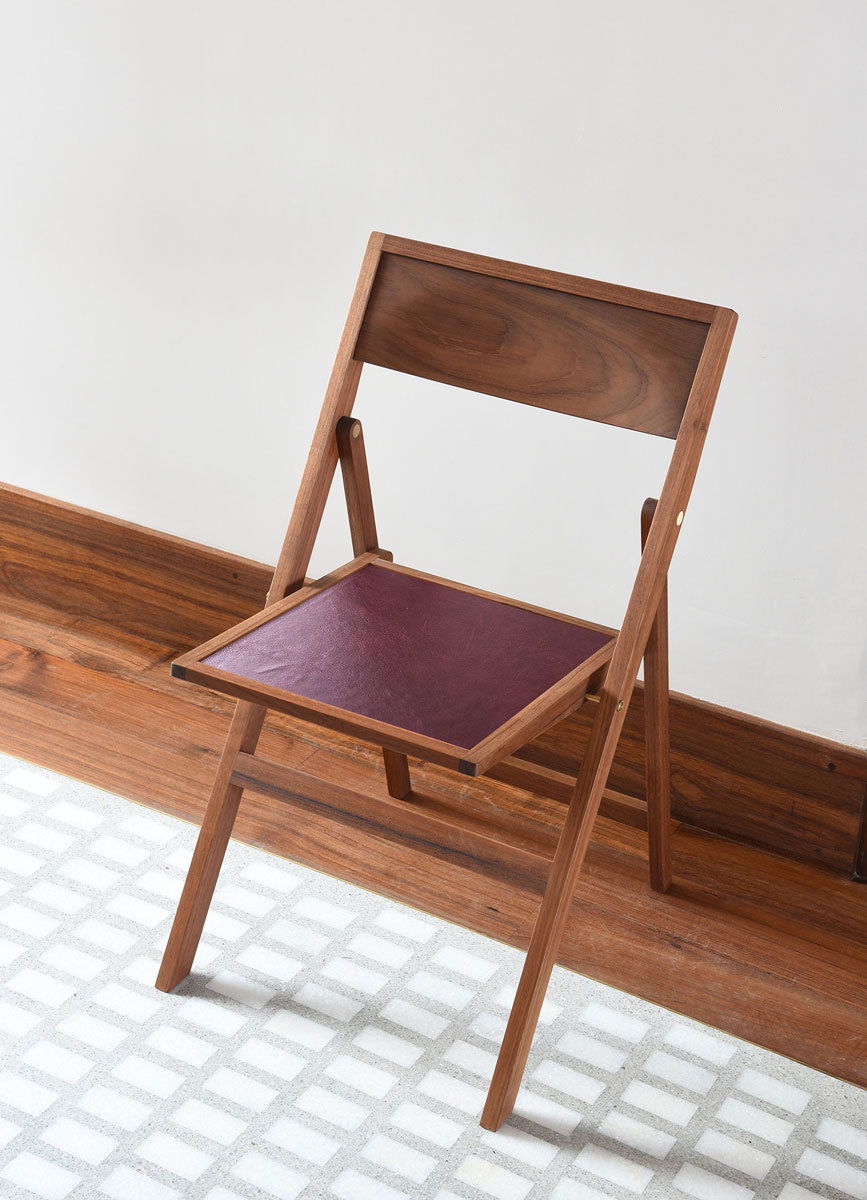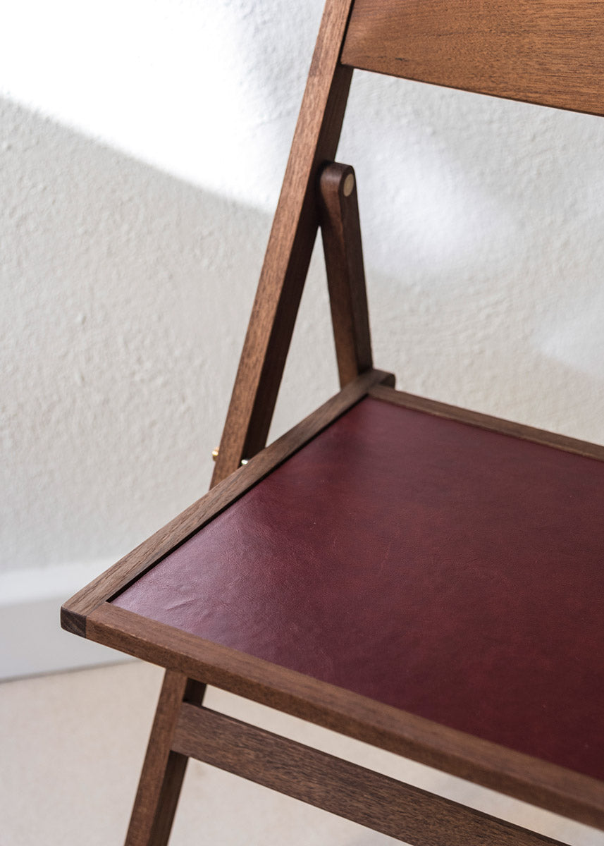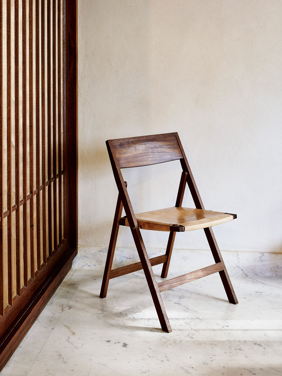 A folding chair designed with clarity and restraint. Solid wood frames and brass–stainless steel hardware allow it to fold to just 4 cm. The seat is available in natural wood, pressed leather, or slung leather—each offering a distinct tactile experience. Light, durable, and graceful in motion.