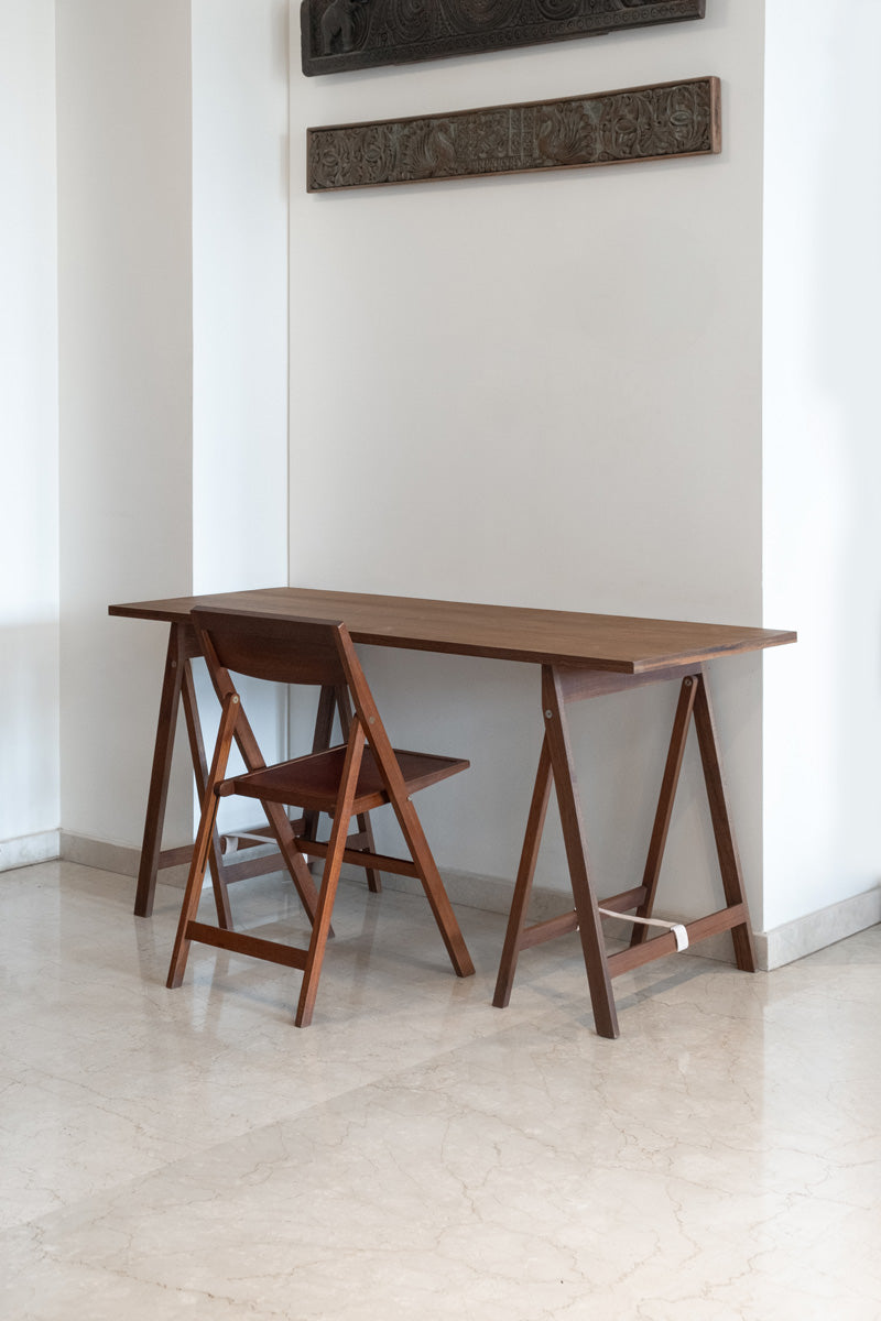 Folding trestles in solid wood, fitted with brass hardware and a leather strap. They fold to 4 cm each for easy storage and can be paired with tabletops in a range of sizes and materials. Adaptable, unobtrusive, and consistently useful.