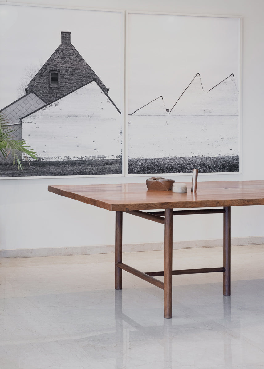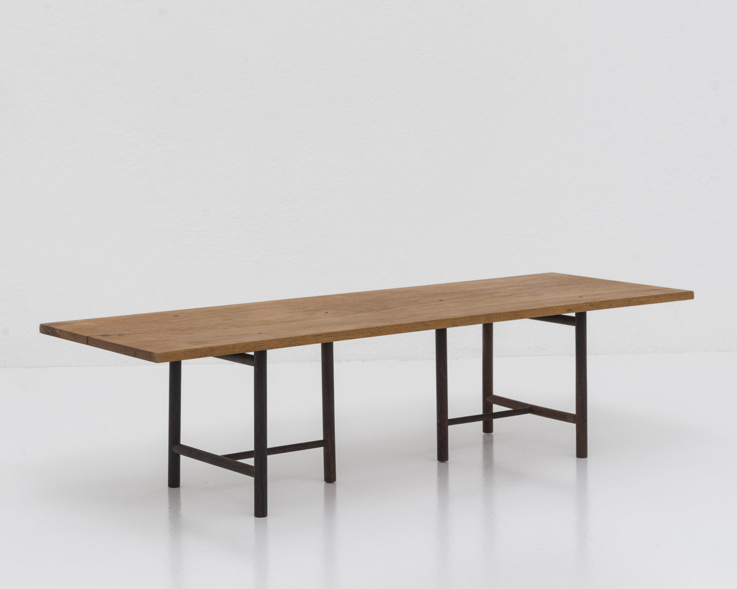 A simple variation on an age-old idea, this table consists of a horizontal surface supported by two free standing trestles. The top can be made of almost any material, limited only by its ability to span. The wooden trestles are sized as per the table top and are typically made from either reclaimed Burma teak.