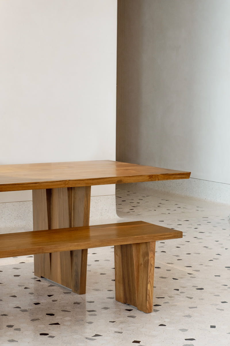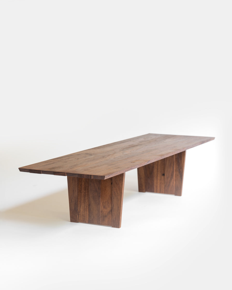 The solid wood alternating furniture series includes a table and bench, and is based on distinguishing each member that constitutes the otherwise unified wooden panels. Subtle inclinations in the legs are designed to provide structural strength.