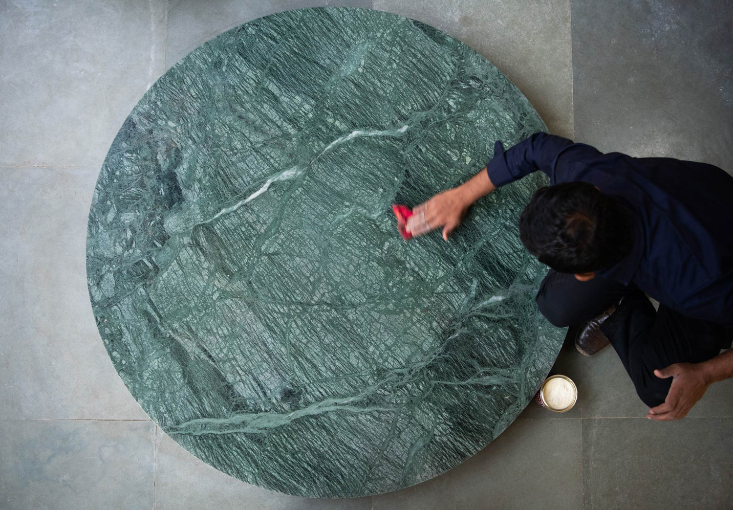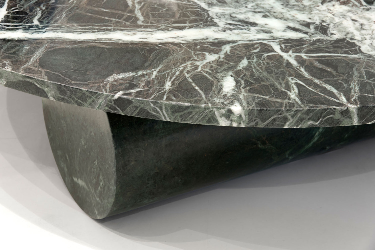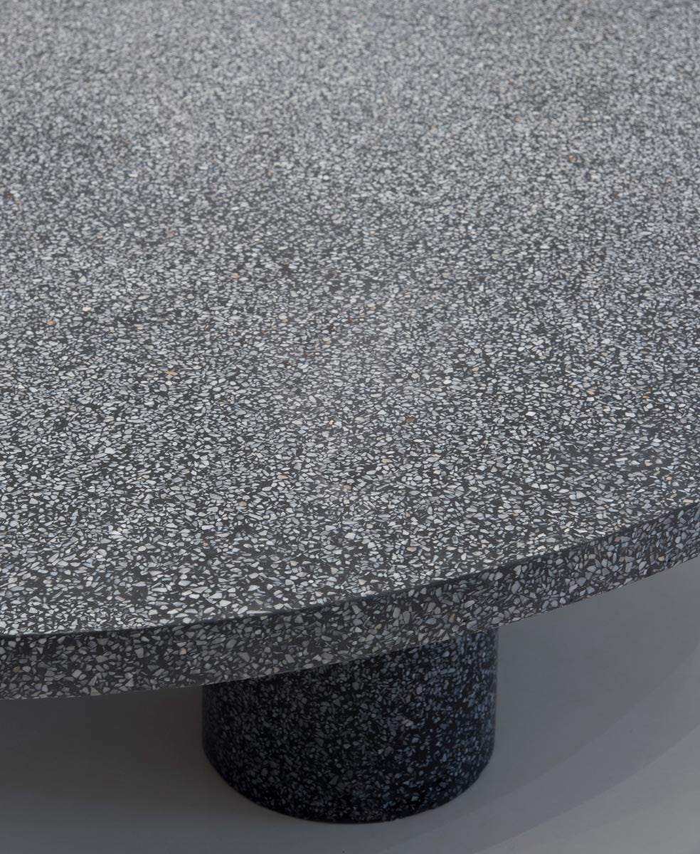 Three stacked cylindrical solids form a low centre table defined by weight, presence, and stillness. A simple composition held together by gravity and proportion.