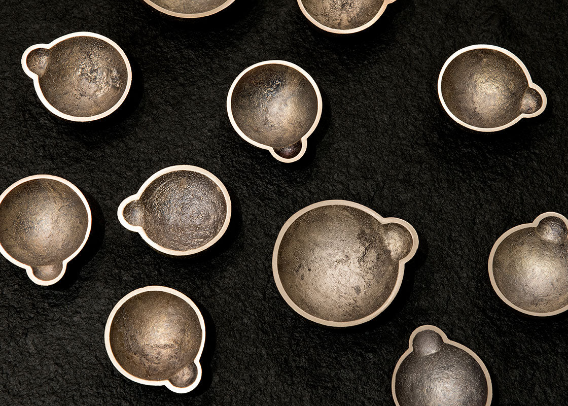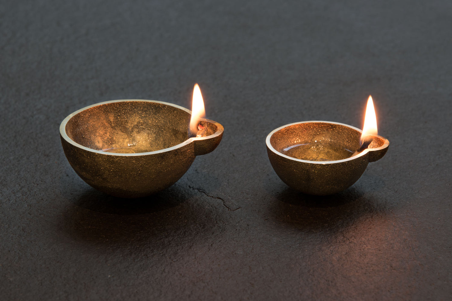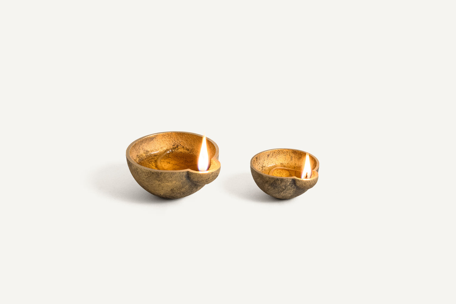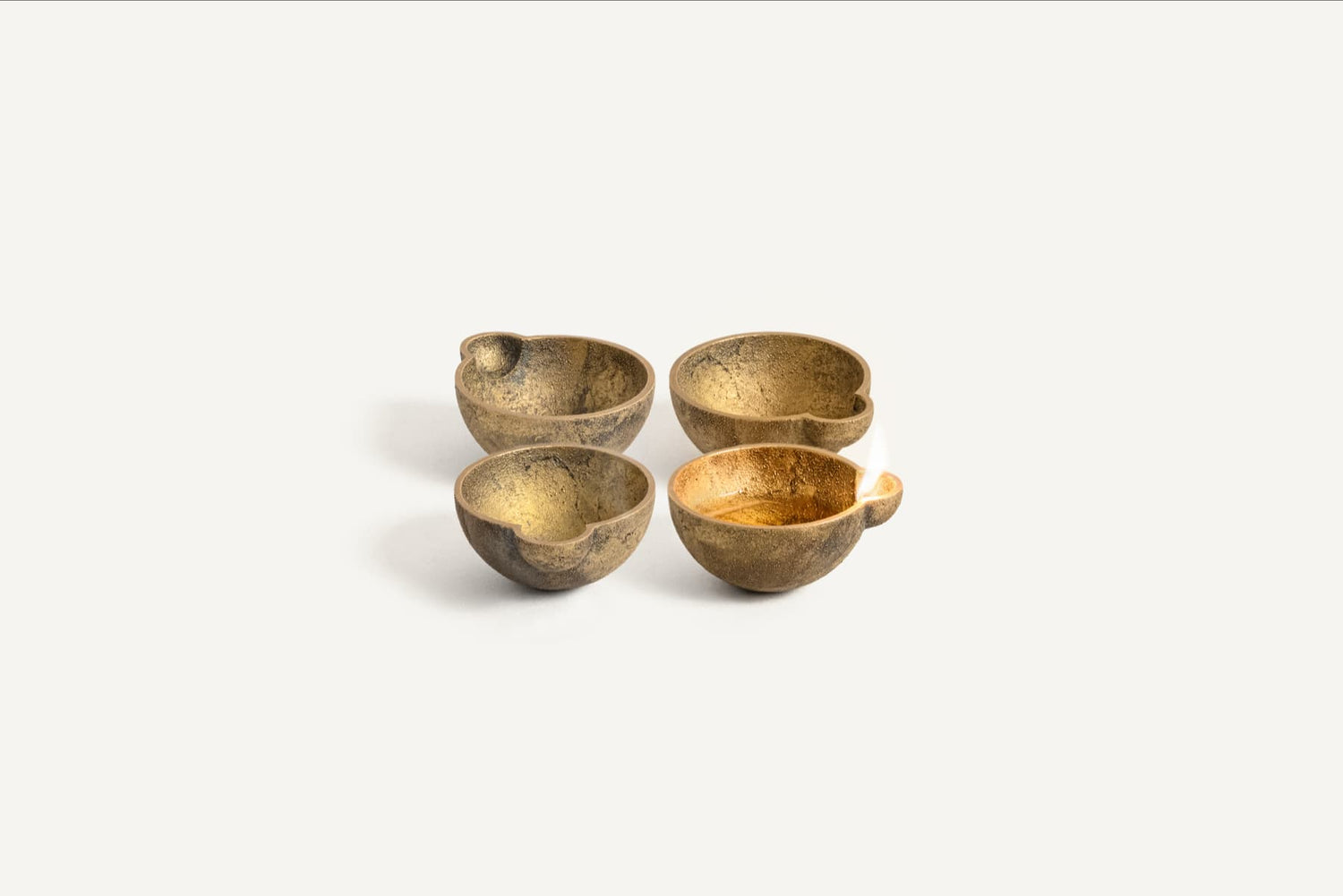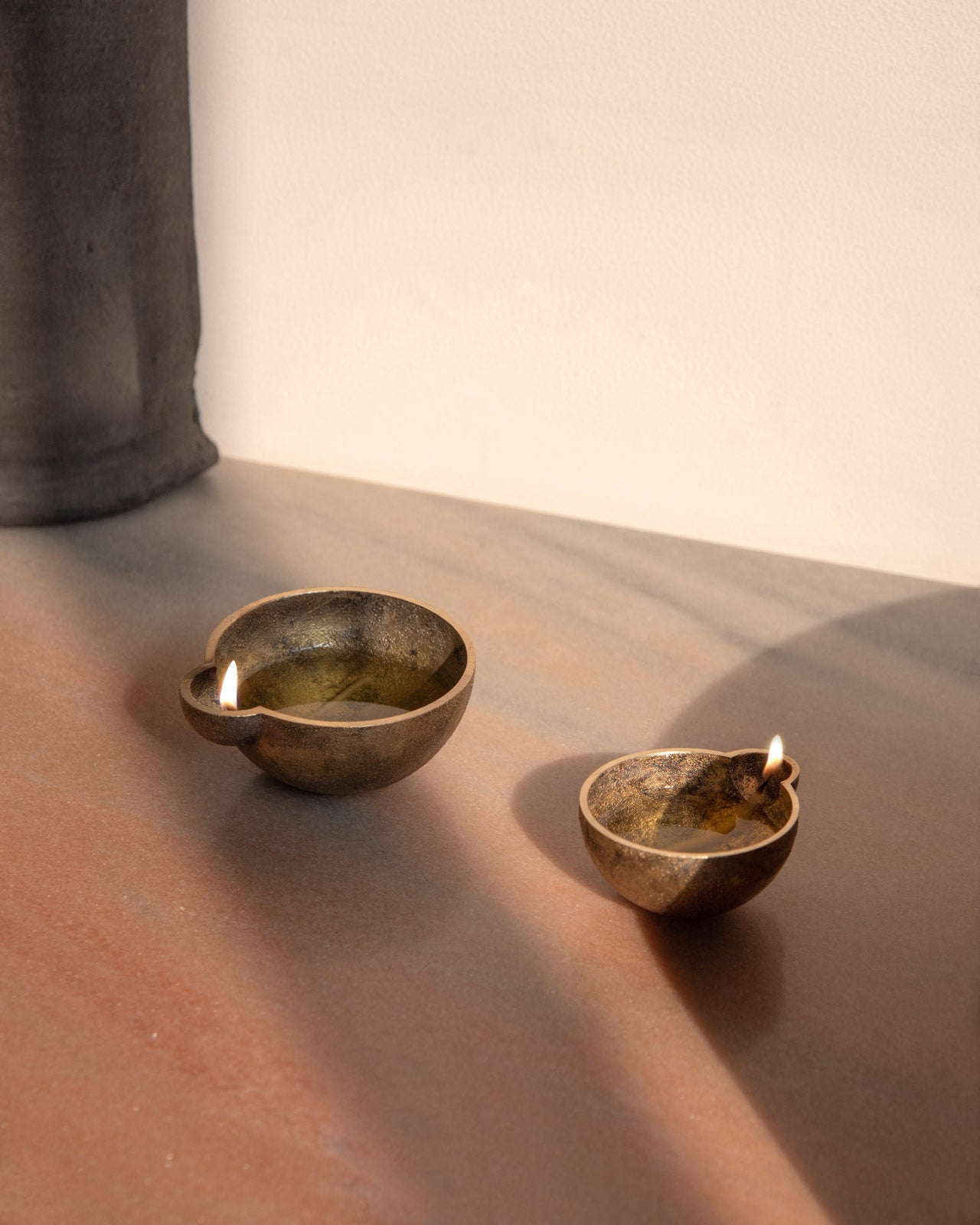 Traditional cast brass oil lamps reinterpreted with a contemporary form. Their sand-cast texture is intentionally preserved, celebrating the subtle variations inherent in the process of making.