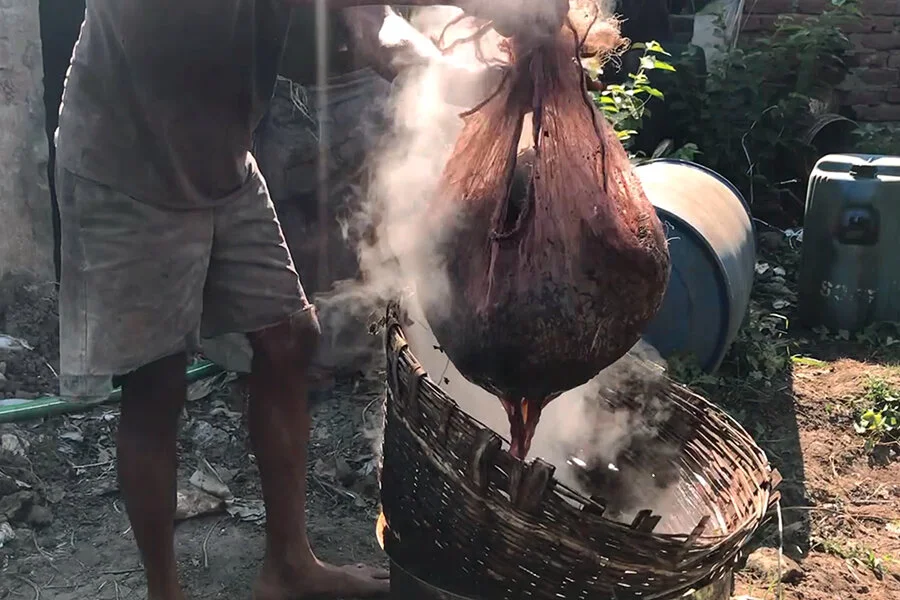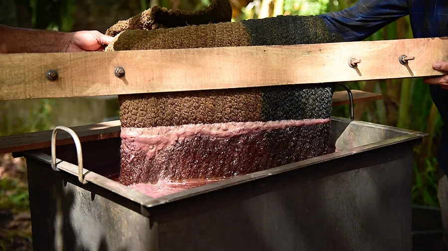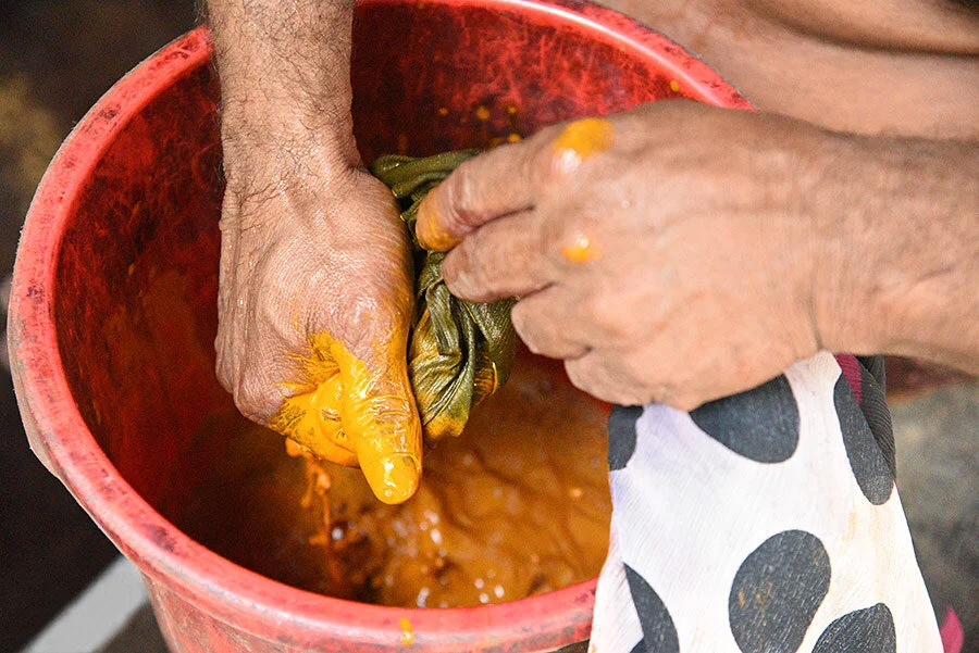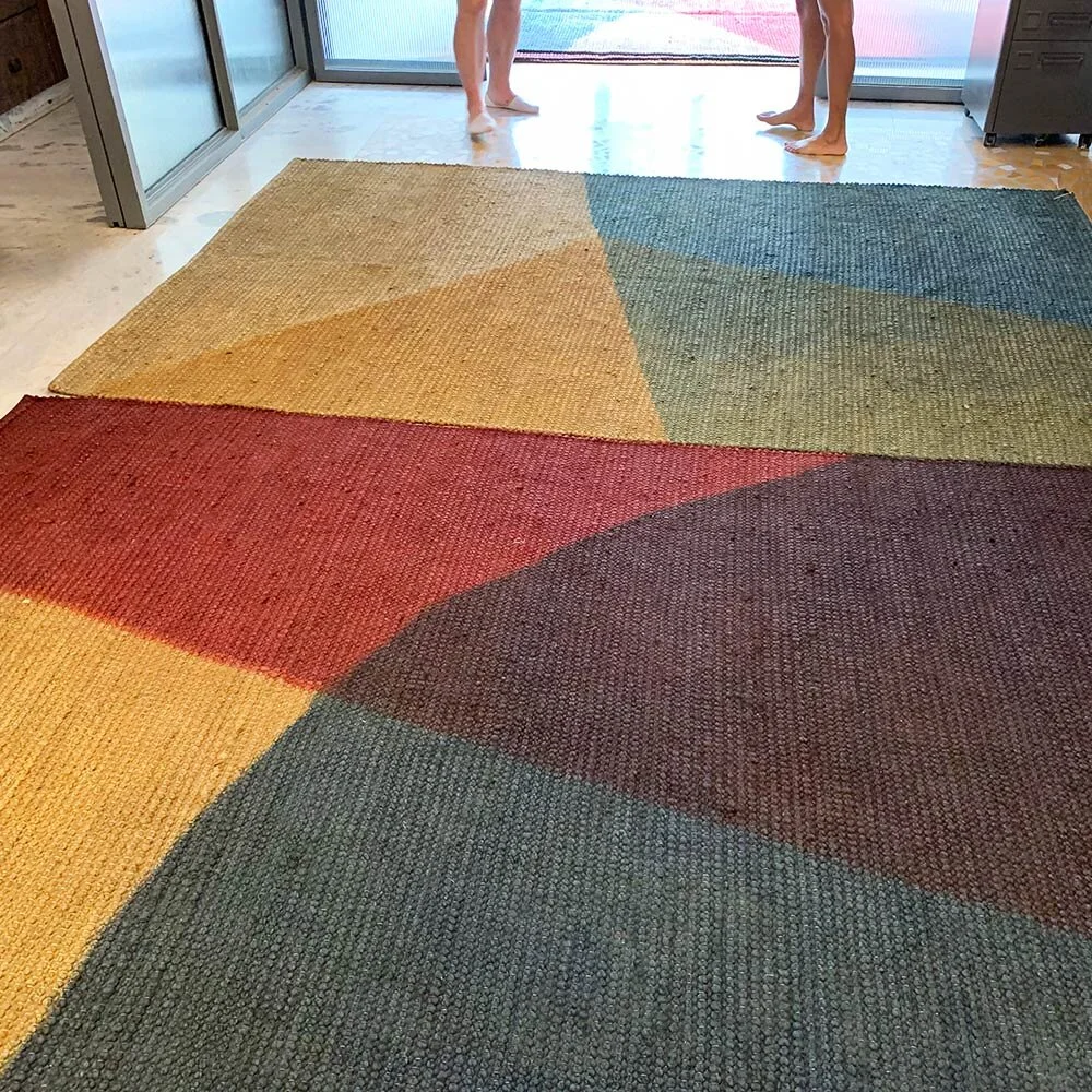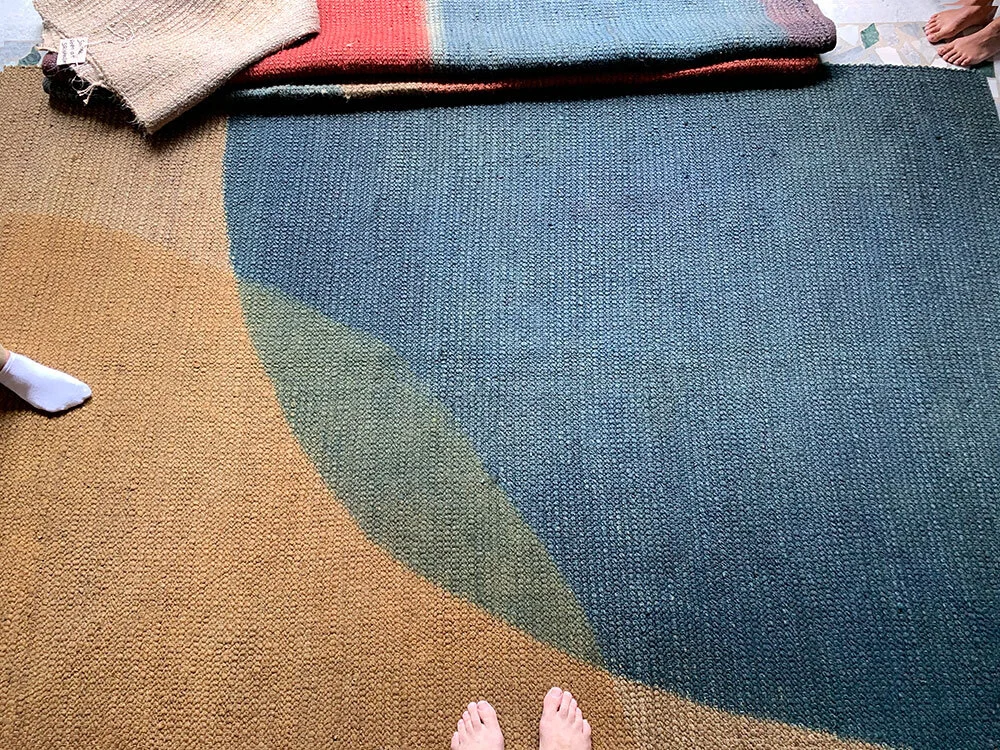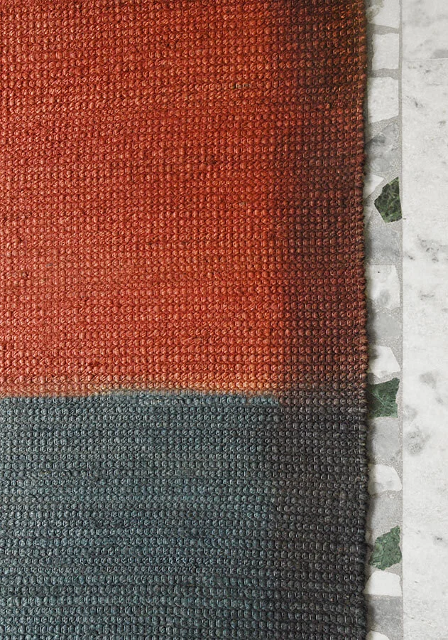 As the largest producer of jute in the world, India has a rich tradition of both hand woven and naturally dyed fibers going back generations. Locally sourced and spun into yarn, these handmade strands are woven into flat dhurries by skilled artisans. In collaboration with crafts based communities in southern India, we have developed a technique of folding, rolling, and dipping these simple carpets in natural, plant based, dyes to achieve bold geometric designs. Materials such as Indigo, pomegranate peels, and madder root produce rich colors that are both beautiful and 100% organic.