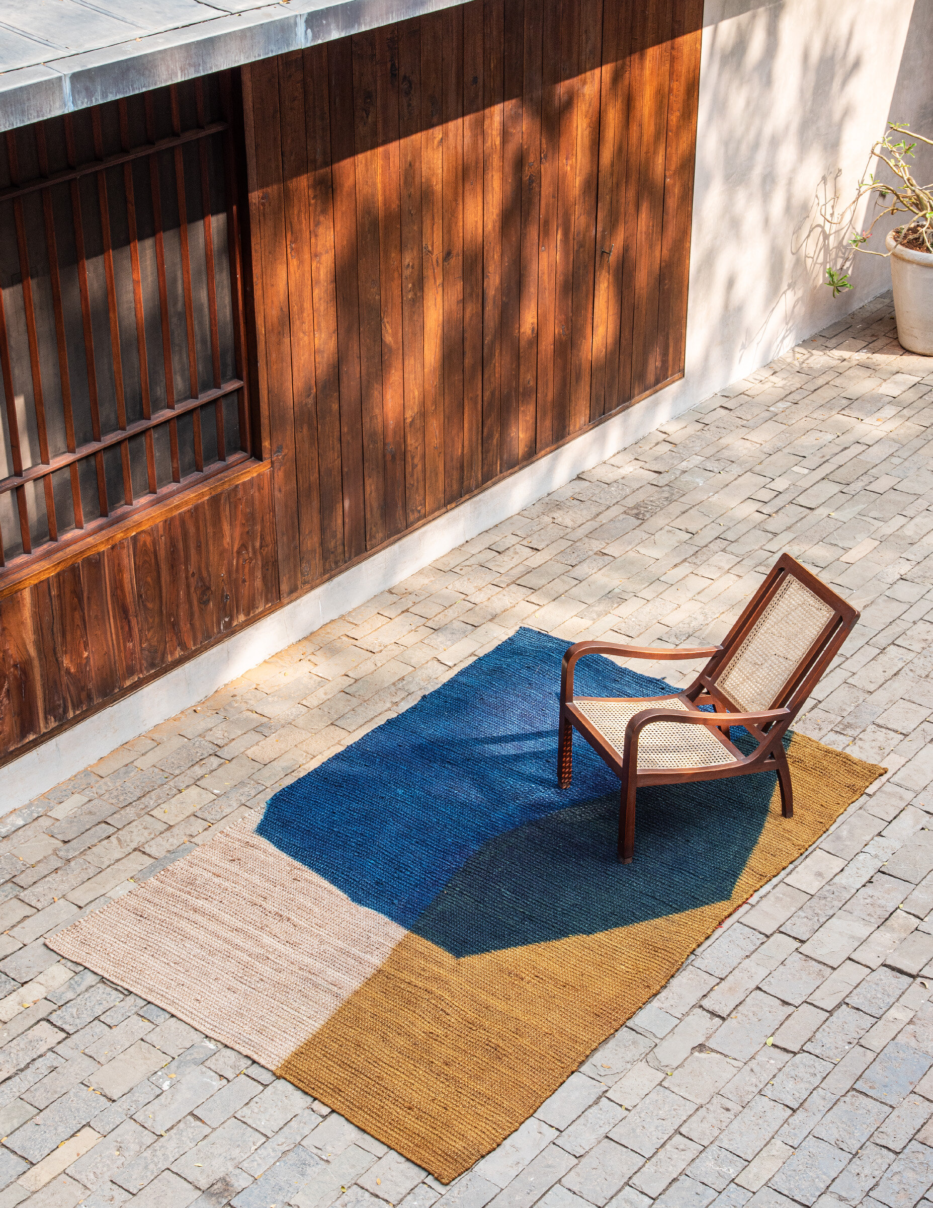 In collaboration with crafts based communities in southern India, we have developed a technique of folding, rolling, and dipping these simple carpets in natural, plant based dyes to achieve bold geometric designs. Materials such as indigo, pomegranate peels, catechu, flame of the forest flowers or madder root produce rich colors that are both beautiful and 100% organic.