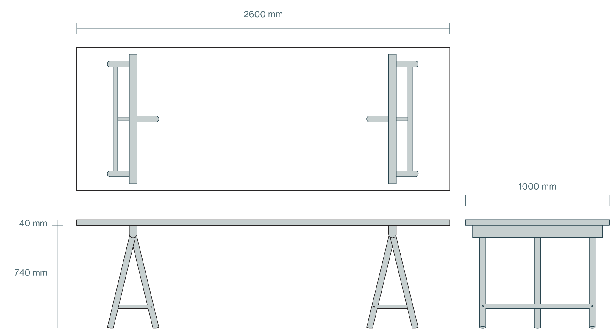 A simple variation on an age-old idea, this table consists of a large horizontal surface laid across two free standing supports. The top can be made of almost any material, limited only by its ability to span. The wooden trestles are sized to order and are typically made from either reclaimed Burma teak or Indian rosewood.